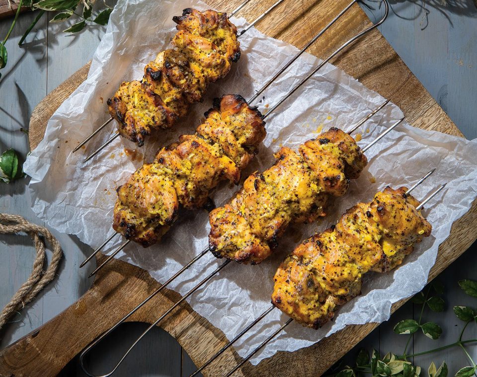 Ανάβετε τη σχάρα σε µέτρια φωτιά. Βγάζετε το κοτόπουλο από τη µαρινάδα (φυλάσσετε τη µαρινάδα) και το περνάτε σε διπλά σουβλιά. Βάζετε το κοτόπουλο στο γκριλ και ψήνετε για 20 λεπτά περίπου, γυρίζοντας 4 φορές και αλείφοντας το κοτόπουλο γενναιόδωρα µε τη µαρινάδα του.