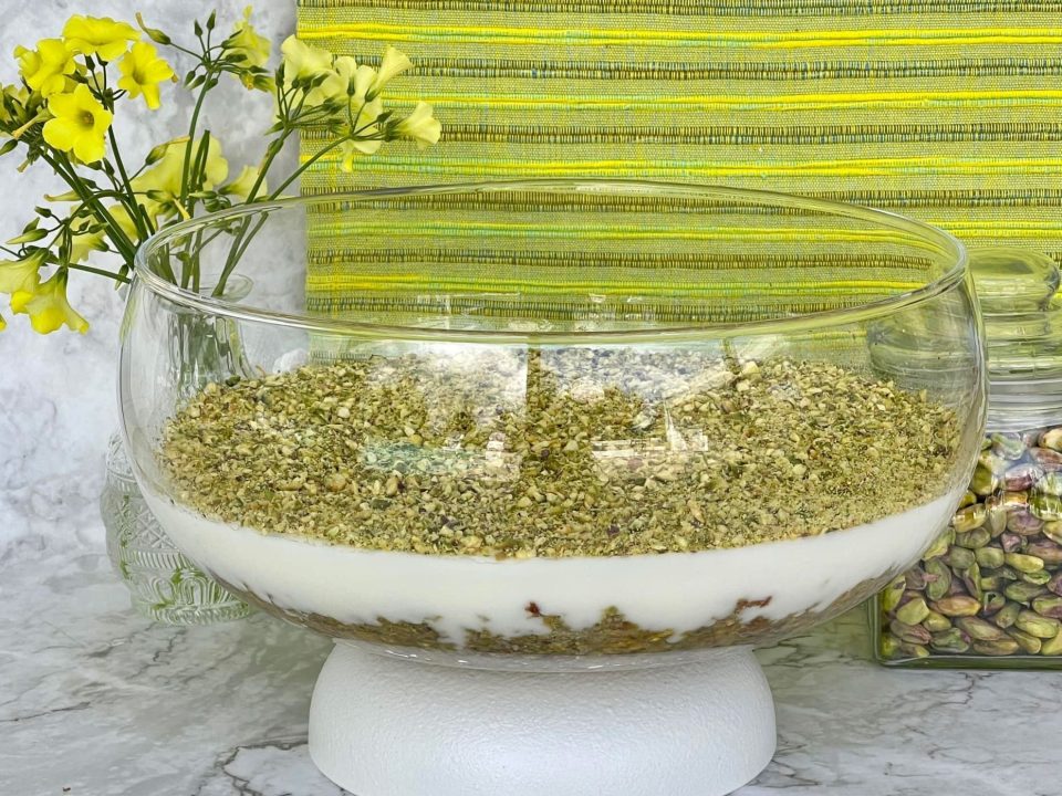Περιχύνετε προσεκτικά την κρέμα πάνω από τη βάση με τα χαλεπιανά. Πασπαλίζετε με επιπλέον αλεσμένα χαλεπιανά αν θέλετε. Αφήνετε το γλυκό να παγώσει στο ψυγείο, τουλάχιστον 6 ώρες πριν το σερβίρετε.