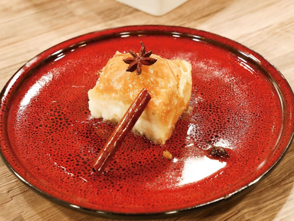 Παίρνετε ένα ορθογώνιο ταψί 24Χ32 εκ. και το αλείφετε με βούτυρο. Βάλετε τα μισά φύλλα στη βάση του (να καλύπτουν και τα πλαϊνά) αλείφοντας τα ένα – ένα με το βούτυρο. Απλώνετε την κρέμα από πάνω και κλείνετε τα φύλλα που εξέχουν τα οποία επίσης βουτυρώνετε.
