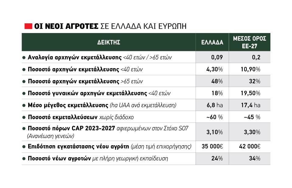 Το ποσοστό αρχηγών εκµετάλλευσης κάτω των 40 ετών φτάνει µόλις το 4,3%, µε την Ελλάδα στην 25η θέση. Συνεπώς, η χώρα ανήκει στην οµάδα µε «πολύ χαµηλό µερίδιο νέων αγροτών».