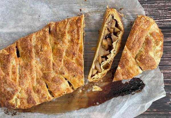 Με ένα κόπτη πίτσας, κόβουμε στο αριστερό και δεξί τρίτο της σφολιάτας οριζόντιες γραμμές πάχους 3 εκατοστών περίπου. Φέρνουμε τις λωρίδες σφολιάτας πάνω από τα μήλα εναλλάξ ώστε να τα καλύψουμε.