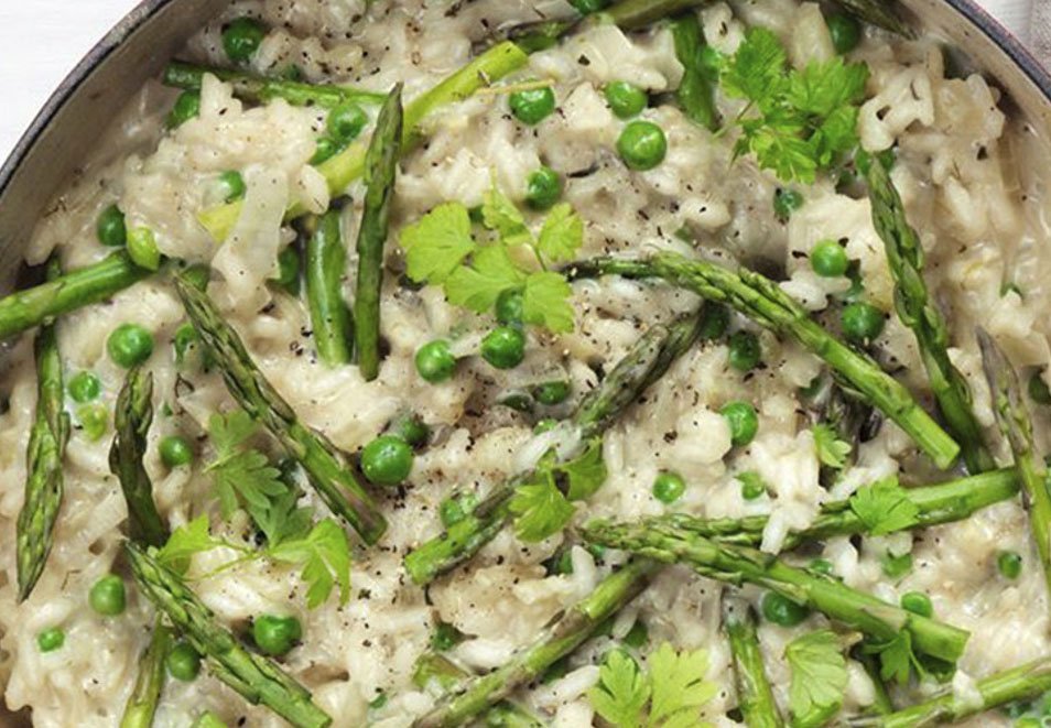 Αλατοπιπερώνουμε. Ανακατεύουμε μέσα τα κατεψυγμένα μπιζέλια και τα σπαράγγια και αφήνουμε το ριζότο να ξεκουραστεί με το πώμα στην κατσαρόλα, για 10 λεπτά. Γαρνίρουμε με φρέσκα βότανα.