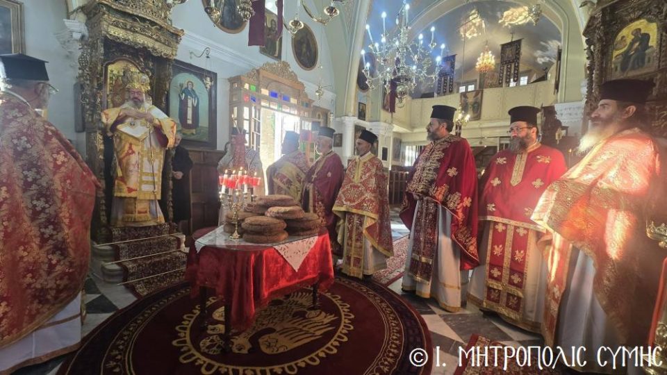 Το απόγευμα της Πέμπτης, ετελέσθη ο Εσπερινός της εορτής και την Παρασκευή, κυριώνυμος ημέρα, ο Θεοφιλέστατος Επίσκοπος Ροδοστόλου κ. Αντώνιος, αδεία και προτροπή του Σεβασμιωτάτου Μητροπολίτου Σύμης, Τήλου, Χάλκης και Καστελλορίζου κ. Χρυσοστόμου, χοροστάτησε του Όρθρου και τέλεσε την Θεία Λειτουργία, με την συμμετοχή πάντων των Εφημερίων της νήσου.