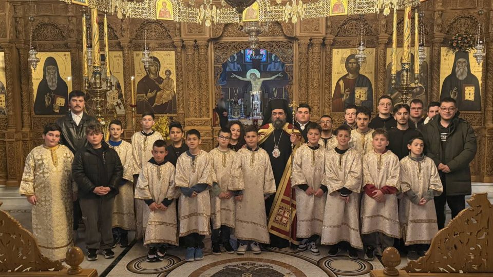 Μετά το πέρας του Εσπερινού, προσφέρθηκε κέρασμα στην αίθουσα του Ιερού Ναού, όπου πραγματοποιήθηκε σύναξη των ιεροπαίδων. Ο Σεβασμιώτατος Μητροπολίτης μίλησε με πατρική αγάπη στα παιδιά, προσφέροντάς τους ως ευλογία ένα βιβλίο με τίτλο «Δύο φύλλα δάφνης στον Παύλο Μελά» καθώς και από ένα κομποσχοίνι, τονίζοντας τη σημασία της νοεράς προσευχής στη ζωή του ανθρώπου.