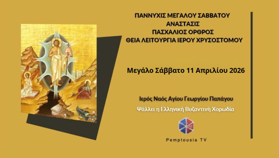 Παρακολουθήστε σε επανάληψη από την Pemptousia TV την Παννυχίδα του Μεγάλου Σαββάτου, την Ανάσταση, τον Πασχάλιο Όρθρο, και τη Θεία Λειτουργία του Ιερού Χρυσοστόμου που τελέστηκαν στον Ιερό Ναό Αγίου Γεωργίου Παπάγου το Μεγάλο Σάββατο 11 Απριλίου 2026: