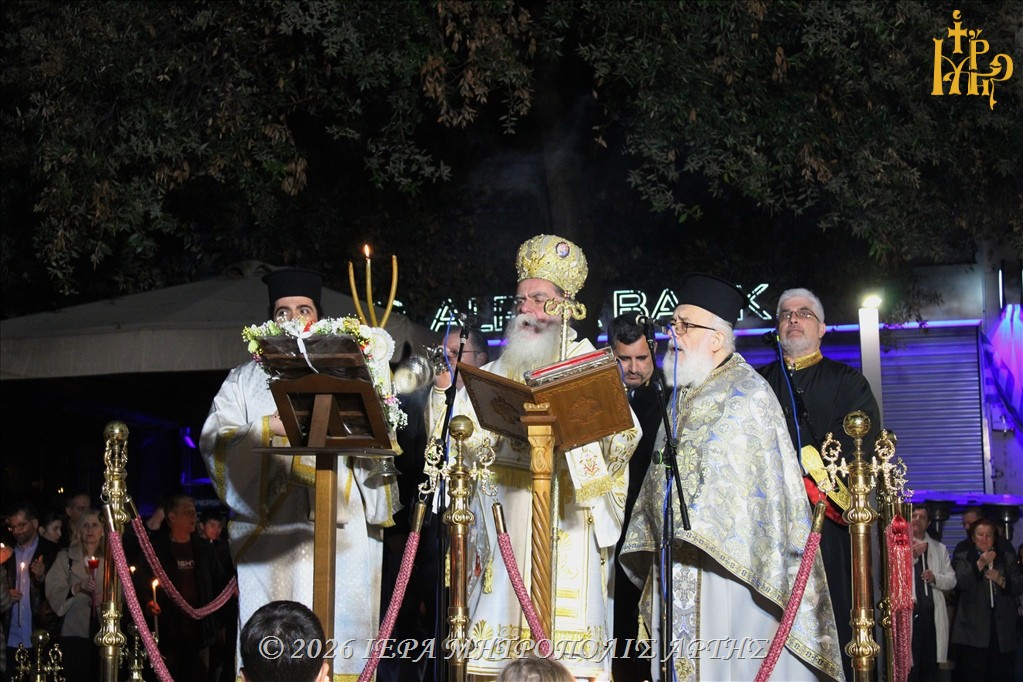 Τα μεσάνυχτα πραγματοποιήθηκε η Τελετή της Αναστάσεως και ακολούθως, η Ιερά Ακολουθία του Όρθρου και η Αναστάσιμη Θεία Λειτουργία, στο τέλος της οποίας ο Σεβασμιώτατος μοίρασε κόκκινα αυγά στους πιστούς.