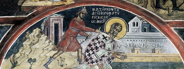Ταύτα δε ειπών και ασπασάμενος δι’ αγίου φιλήματος τους Κληρικούς και τον Ελπιδοφόρον είπεν εν χαρά εις τον δήμιον: